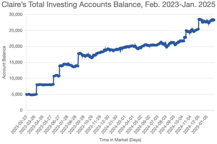 Claire’s Total Investing Accounts Balance, Feb. 2023-Jan. 2025