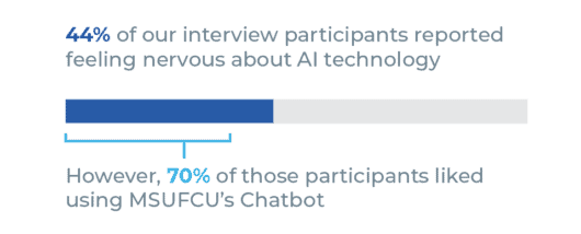 A growing skepticism has accompanied the recent surge in awareness around AI—almost 50% of our interview participants reported feeling nervous about AI technology. However, we found that these attitudes did not necessarily translate into distrust of chatbots: many people who reported feeling wary of AI in general viewed chatbots as convenient and useful. The proximity of Fran to live customer service may enhance this feeling of greater comfort, with around one-quarter of chatbot conversations handed over to a human agent at some point, according to MSUFCU data.