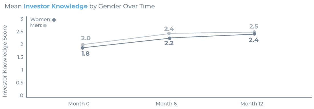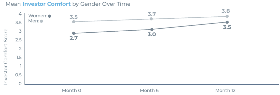 Despite starting at a significantly lower baseline, women showed greater gains in self-reported knowledge of and comfort with investing during the first year, closing much of the initial gap with men. This process highlights the ways in which inclusive design can help beginner investors overcome systemic barriers, including embedded attitudes about their own capabilities, empowering women and other underrepresented groups to take full advantage of the wealth-building opportunities afforded by capital markets. Ellevest provides a platform designed to make women feel more comfortable and confident as investors.