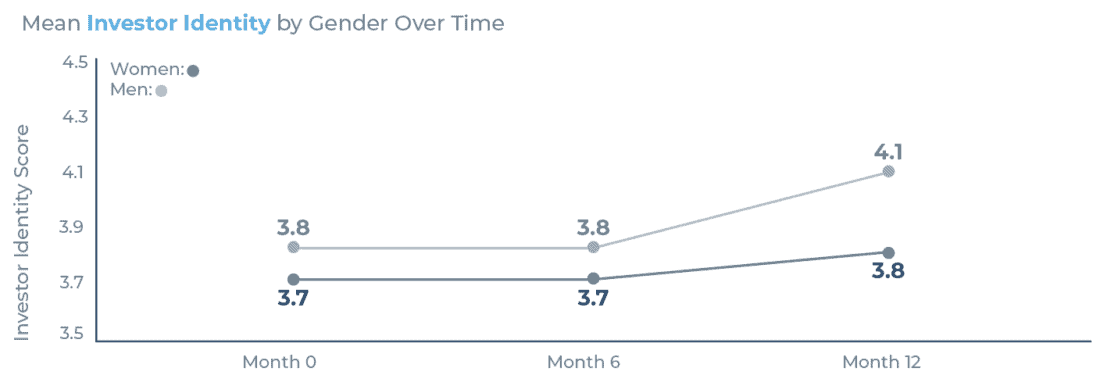 - Investor identity “clicks” after 6 months: Overall, average investor identity scores for participants grew during the first year. Most of this increase happened during the second six months of participation, highlighting a dynamic in which early experiences eventually start to “click” and translate into changing perceptions of oneself as an investor over the course of the first year. For providers, this means that the initial phase of laying the foundation for beginner investors should be understood to extend beyond onboarding, with the first six months a critical incubation period when the elements that give rise to investor identity are cultivated.