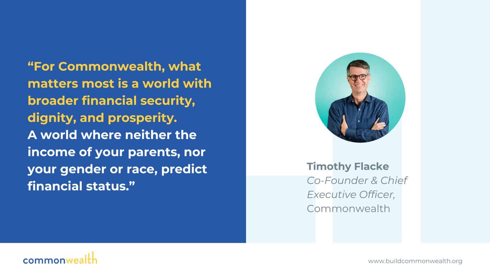 For Commonwealth, what matters most is a world with broader financial security, dignity, and prosperity. A world where neither the income of your parents, nor your gender or race, predict financial status. I believe these are nearly universal aspirations, shared by the overwhelming majority of people—and ones that serve us all well.