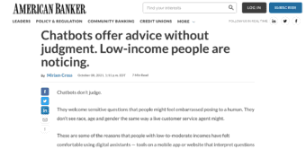 American Banker referenced Commonwealth’s research and highlighted recent opportunities and developments of chatbot usage as a means of communication. Learn more about the dramatic increase in conversational AI and the opportunity it presents to meet the needs, wants and aspirations of people living on low- to-moderate incomes.
