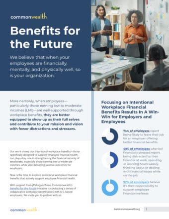 Benefits for the Future (BFF) is Commonwealth’s multi-year initiative to change that. We partner with employers and benefit providers to research, design, and pilot intentional workplace financial benefits—those that are outcome-focused, responsive to LMI workers’ needs, and additive to existing benefit offerings. Through the philanthropic support from JPMorganChase, our expertise and services are provided at no additional cost to employers.