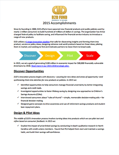 This report describes Commonwealth's most notable accomplishments that occurred at every stage of the innovation pipeline – discover, design, pilot and scale – in 2015.