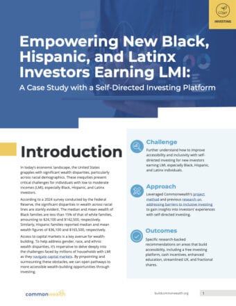 Commonwealth sought to further understand the experiences of Black, Hispanic, and Latinx investors in a six-month study through observational field research with a self-directed investing platform. This project involved 472 participants, focusing particularly on households earning LMI (under $80,000). Participants were given seed funding, created accounts on the self-directed investing platform, and participated in surveys and interviews about their experiences. They self-reported their experience with investing, with the majority saying they were first-time investors.