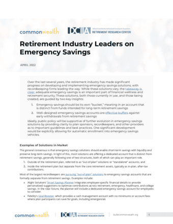 Over the last several years, the retirement industry has made significant progress on developing and implementing emergency savings solutions, with recordkeeping firms leading the way. While these solutions vary, the takeaway is clear: adequate emergency savings is an important part of financial wellness and retirement security. These solutions, both those currently in use, and those being created, are guided by two key insights: