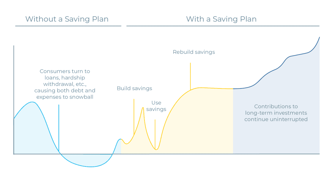 Where there’s a short-term financial stability problem, long-term financial stability challenges aren’t far behind. Blackrock’s Emergency Savings Initiative found that workers with inadequate emergency funds are 13 times more likely to take a hardship withdrawal from their 401(k)s. The good news is, that 72% of workers say they would participate in an emergency savings program2, and workers with emergency savings are 70% more likely to contribute to their employer-sponsored retirement plan.3